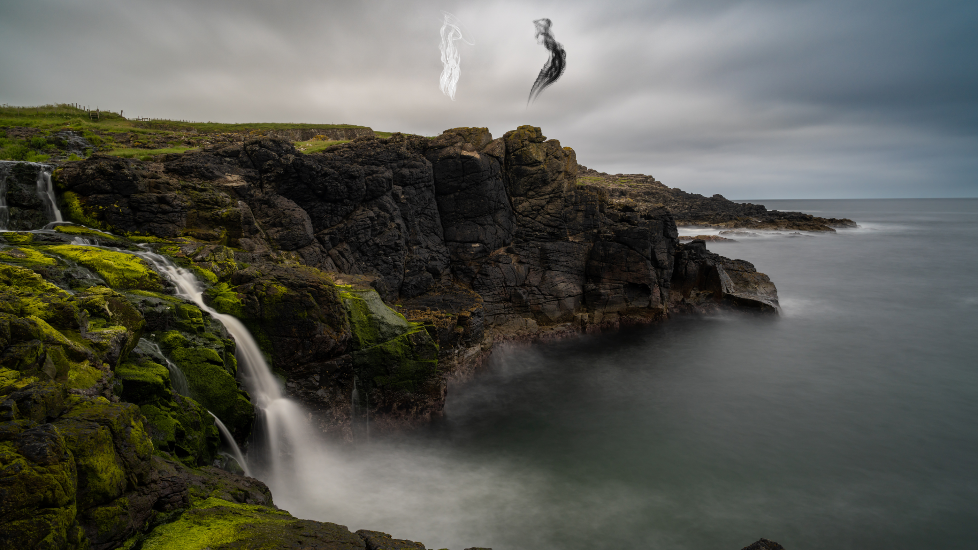 The Queen walks out of the portal from the palace, determination in every step. The rifts warble above the cliffs, floating there like wisps of smoke; one black, one white. The wind whispers through the petals of her crown, only her magic keeping them from blowing away.
